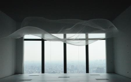 大巻伸嗣(1971年~)の「リミナル・エアー スペース-タイム」は、無限に変化する空気の流れを可視化する“風の彫刻”だ。水平に張られた布状の素材が、床下から送風機で吹き上げる風で形を変え、単純でありながら、千変万化の“複雑な美しさ”をみせる。送風機はコンピューター制御によってパターン化を崩され、同じ風にならないようにセットされている。いわば、「自然の風」を人工的に生み出しているのだ。