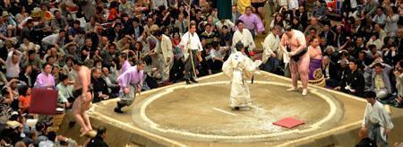 白鵬が初日に黒星を喫するのは3年ぶり。逸ノ城にとっては5度目の対戦での初勝利。場内は興奮し、投げることを禁じられた座布団が飛び交った。