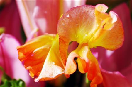 霧吹きなどで室内の花に吹きかけて、水滴を撮影しました。太陽光の当たる角度が重要になってきますが、窓からの光が真横になるように花を置いて撮影しました。カメラには防塵・防滴構造を採用しているので、少々の水がかかっても壊れません。