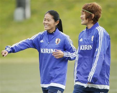W杯へ向け調整する川村優里(ゆうり、左)と川澄奈穂美(なほみ)=2015年6月3日、カナダ・ブリティッシュコロンビア州バンクーバー(共同) サッカーの女子ワールドカップ(W杯)カナダ大会に臨む日本代表「なでしこジャパン」は3日、バンクーバーで宮間(岡山湯郷(ゆのごう))や澤(INAC神戸)らが実戦形式の練習をした。冒頭15分以外は公開せず、1日に現地入りしてから初の非公開練習となった。
