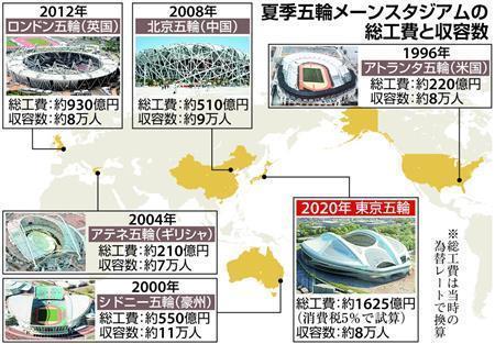 JSCはハディド案採用当時、建設費を1300億円と見積もっていたが、資材高騰などの影響で3000億円に膨らむことが判明。14年5月、競技場の規模縮小などで建設費を1625億円まで削ったが、人件費の高騰や消費税率引き上げ分もあって、最終的には2500億円程度に膨らむ公算が大きい。