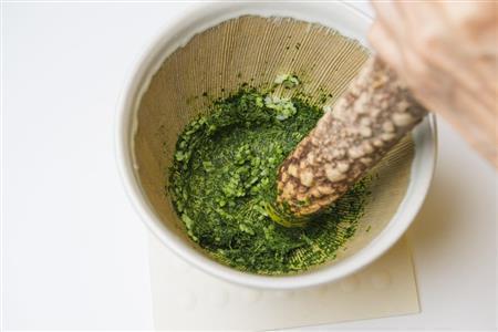 〔1〕たで2束の軸から葉を外しさっと洗い水気を押さえ、すり鉢でつぶしながらあたる。