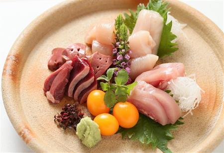 早速、自慢のメニューの数々をいただいた。まずは「鶏刺し」。完全無菌状態で飼育し、甘さやうま味が絶品と評される兵庫・丹波篠山の「高坂鶏」のむね肉やささみ、もも肉、レバーなどの盛り合わせだが「熟成が利く鶏」と丸山さんが言うだけあって、「他の鶏では味わえない濃縮されたうま味」(村上聡孝料理長)が堪能できる。