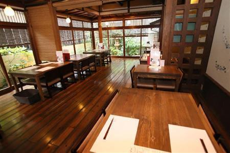 柳馬場通からお店をめざし、細い路地を入っていくと、足元には京都の町名を記した陶器のプレートが石畳のように規則正しく敷き詰められている。粋な演出に気持ちも盛り上がる。玄関から店内へと足を踏み入れると、広々とした空間が広がる。町家を改装したお店だけに、上品さや高級感も随所に。庭の眺めも素晴らしい。