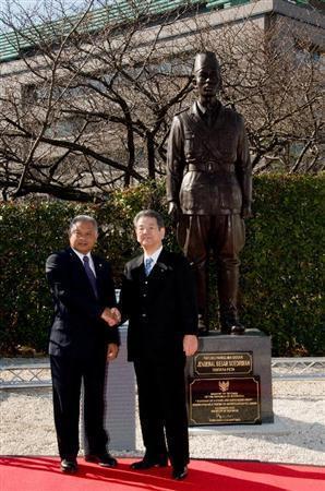 2011年1月14日、インドネシアから防衛省に寄贈されたスディルマン陸軍大将(1916~50年)の銅像の除幕式後、像の前で握手する北沢俊美防衛相(当時、右)とインドネシアのプルノモ国防相。将軍は大日本帝國陸軍から不屈のセイシン(精神)を学び、インドネシアの独立戦争を戦い抜いた(防衛省提供)