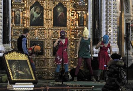 首都モスクワの救世主キリスト大聖堂でゲリラライブを行うプッシー・ライオットのメンバー=2012年2月21日、ロシア(AP)