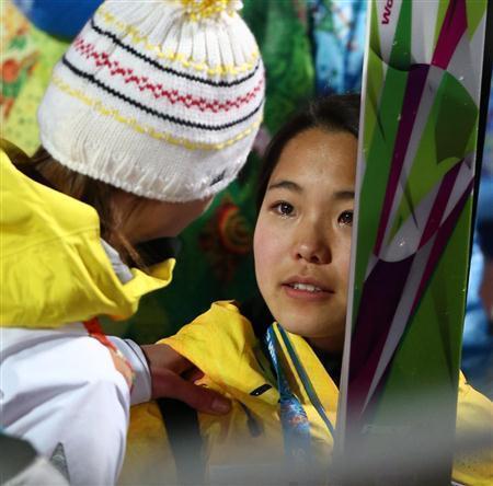 メダルを逃した後、多くの選手から声をかけられる高梨沙羅。気丈に振る舞っていたが、目には涙がたまっていた=2014年2月11日、ロシア・ソチのルスキエゴルキ・センター(大里直也撮影)