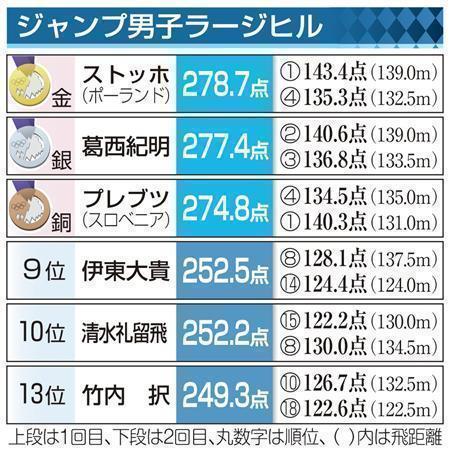 【ソチ五輪】ジャンプ男子ラージヒル=2014年2月15日、ロシア・ソチ、※上段は1回目、下段は2回目、丸数字は順位、カッコ内は飛距離