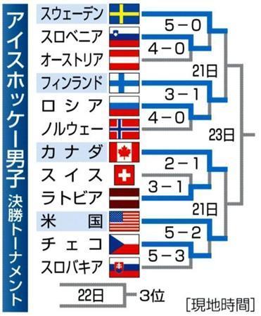 【ソチ五輪】アイスホッケー男子(決勝トーナメント)=2014年2月19日現在、ロシア・ソチのボリショイ・アイスドーム、※現地時間