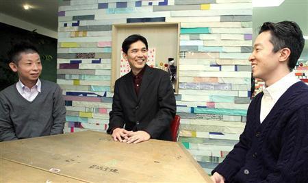 筒井啓介さん(左)、青山雄二さん(右)との鼎談(ていだん)は学習塾の古い机を利用したラウンドテーブルを囲んで行われた。テーブルは「合格するぞ!」などの落書きがそのまま残されている=2014年2月12日、東京都千代田区(宮崎裕士撮影)