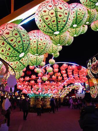 - クジャクを中心に鳥類をデザインした大型のランタンも人気を集めていた=2014年2月15日、台湾・南投県中興新村(原川貴郎撮影)更新