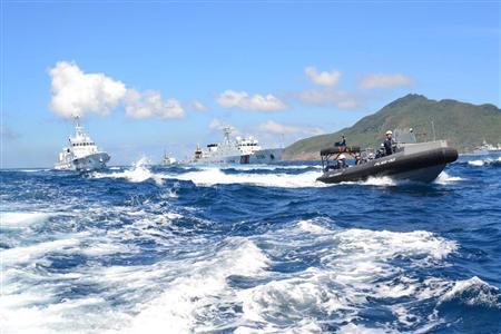 尖閣諸島(沖縄県石垣市)の魚釣島周辺で領海侵犯した中国船「海警」(中央)と、警戒に当たる海上保安庁の巡視船とボート。今や偶発的な衝突など不測の事態がいつ起きてもおかしくない状況だ=2013年8月7日(沖縄県石垣市の仲間均・市議提供)