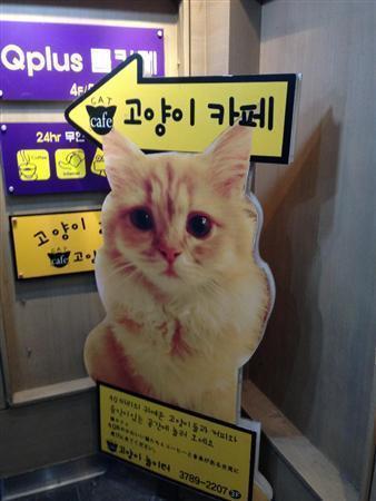 妙に心惹かれる猫カフェの巨大看板。韓国で見つけました=2014年2月22日、韓国(本谷有希子さん撮影)