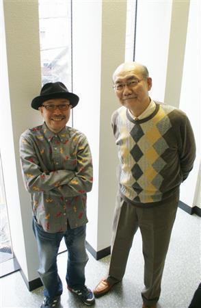 久住(くすみ)昌之さん(左)と土山しげるさん、グルメ漫画界のスターが初タッグを組んだ=2014年3月27日、東京都渋谷区(塩塚夢撮影)