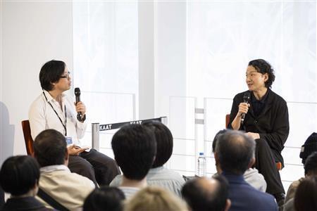 公開リハーサル後のトークセッションで演出家の本音を語った岡田利規さん(左)と白井晃さん=2014年5月6日、神奈川県横浜市中区のKAAT神奈川芸術劇場(提供写真)