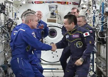 後任のスティーブン・スワンソン飛行士(左)と握手し、国際宇宙ステーション(ISS)の船長任務を引き継ぐ若田光一さん(右)=2014年5月13日未明(日本時間、NASAテレビから)