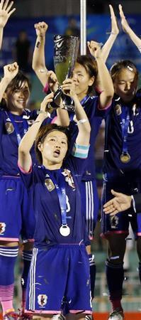 アジアカップを授与され高々と掲げる主将の宮間あや。後ろは左から川澄奈穂美、岩清水梓(あずさ)、澤穂稀(ほまれ)=2014年5月25日、ベトナム・ホーチミン(共同)