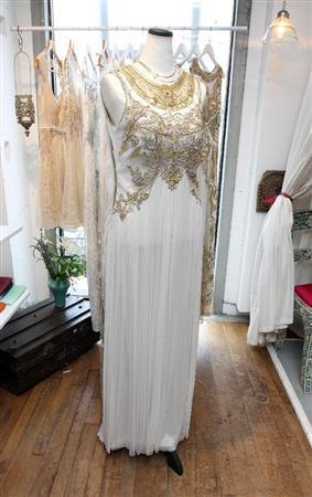 - 金糸とパールビーズが全身にあしらわれた、豪華なウェディングインド人デザイナー2人組「ゲイシャデザインズ」の作。オーダーで受け付ける(28万円)=2014年6月18日、東京都渋谷区(野村成次撮影)。※価格はすべて税別です。更新