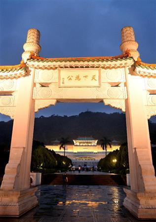 - 天下為公アーチの向こうに故宮博物院(本館)が建つ。美しくライトアップされ、薄暮の空に浮かび上がった=2014年5月23日、台湾・台北市(奈須稔撮影)更新