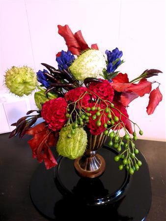 - (手順3)メインの花であるケイトウを5輪固まりにして中央に挿し、その後ろにリンドウをバランスよく挿す(花千代さん提供)更新