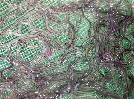 ウナギの稚魚であるシラスウナギ=2014年2月26日、神奈川県(宮崎裕士撮影)