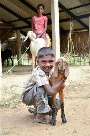 - 支援されたヤギを抱いて嬉しそうな男の子=2012年12月16日、スリランカ・キリノッチ(ワールド・ビジョン・ジャパン撮影)更新