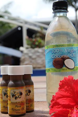 【バヌアツのおすすめお土産】1位「タマヌオイル」と3位「ココナッツオイル」=2014年9月11日、バヌアツ(相川梨絵さん撮影)