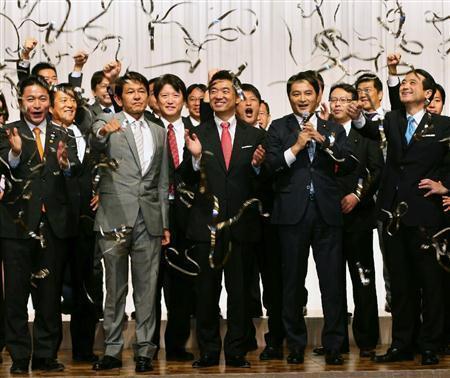 「維新の党」の結党大会で気勢を上げる共同代表の橋下(はしもと)徹氏(前列中央)、江田憲司氏ら(前列右端)=2014年9月21日午後、東京都港区(蔵賢斗撮影)
