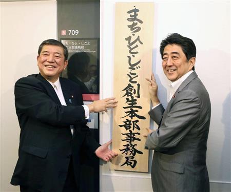 「まち・ひと・しごと創生本部事務局」の看板を掛ける安倍晋三(しんぞう)首相(右)と石破(いしば)茂地方創生相=2014年9月5日、東京都千代田区永田町(共同)