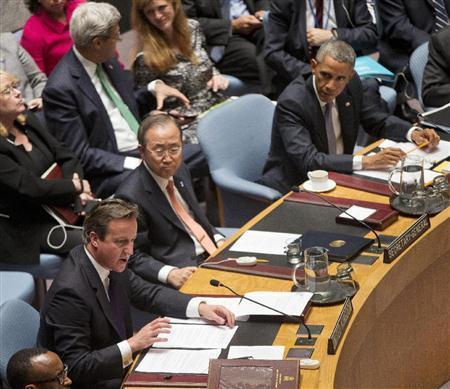 - 国連安全保障理事会首脳級特別会合でデービッド・キャメロン英首相(左)の発言を見守るバラク・オバマ米大統領(右)と国連の潘基文事務総長(中央)=2014年9月24日、米ニューヨーク(AP)更新