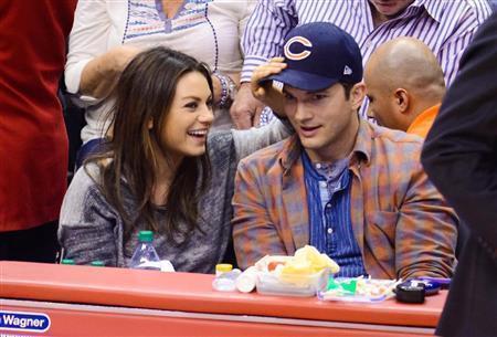 女優、ミラ・クニスさん(左)と、婚約者の人気俳優、アシュトン・カッチャーさん=2014年3月22日、米カリフォルニア州ロサンゼルス(ゲッティ=共同)