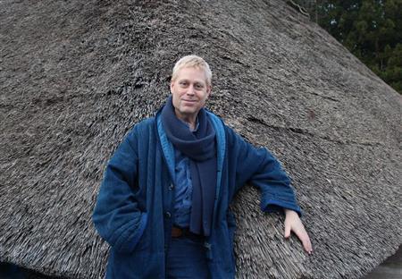 徳島県祖谷(いや)に立つ築300年の茅葺き家屋「ちいおり」の前に立つアレックス・カーさん=2012年4月9日、徳島県三好市(提供写真)