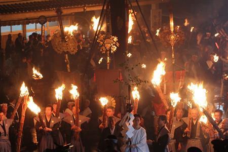- 鞍馬の火祭で赤々と燃える松明(たいまつ)を担ぐ人々=2014年10月22日午後8時50分、京都市左京区(恵守乾撮影)更新
