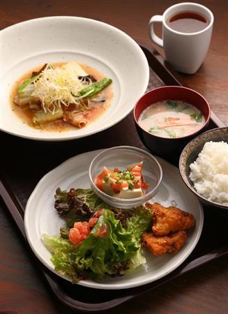 - 週替わりの平日ランチ「豚バラ肉の五目中華煮込み」(940円)は、ご飯、サラダ、スープ、一品、飲みものつき。ボリュームのあるランチも野菜がふんだんにとれるので女性にとってうれしい。ランチは他にうどんやサンドイッチも=2014年10月20日、京都市北区(恵守乾撮影)更新