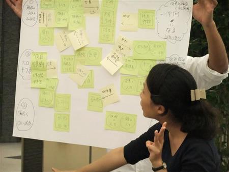 日本財団の職員が組織横断で参加して行われ勉強会。模造紙にステークホルダーと成果を書き込み、プロジェクトをブラッシュアップしていく=2014年10月3日(日本財団撮影)