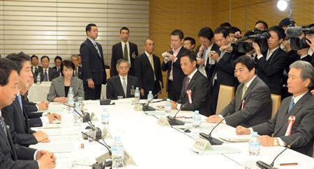 経済財政諮問会議であいさつする安倍晋三(しんぞう)首相(左から2人目)=2014年11月18日午後、首相官邸(酒巻俊介撮影)