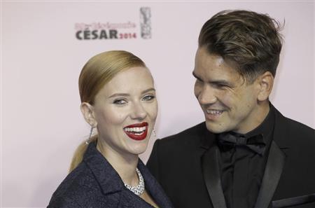 米女優、スカーレット・ヨハンソンさん(左)と仏ジャーナリスト、ロマン・ドリアックさん=2014年2月28日、フランス・首都パリ(AP)