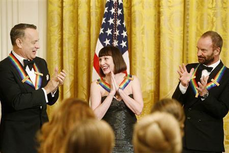 米俳優、トム・ハンクスさん(左)と英ミュージシャン、スティングさん(右)=2014年12月8日、米国・首都ワシントン(ロイター)