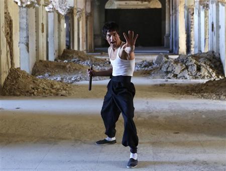 アフガニスタンの首都カブールの廃墟で、ヌンチャクを持ちポーズを決めるアッバス・アリザダさん。ネット上では、「ブルース・リーの生まれ変わりだ」などと大反響を呼んでいる=2014年12月9日、アフガニスタン・首都カブール(ロイター)
