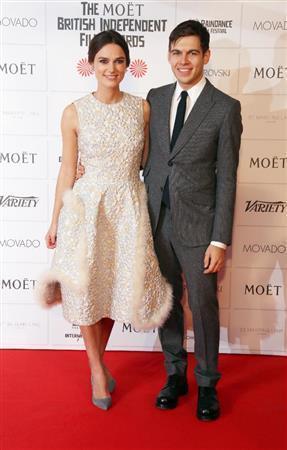 英女優、キーラ・ナイトレイさん(左)と英ロックバンド「クラクソンズ」のジェイムズ・ライトンさん=2014年12月7日、英国・首都ロンドン(AP)