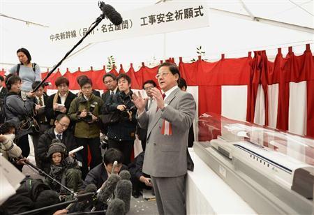 リニア中央新幹線の「工事安全祈願式」を終え、報道陣の質問に答えるJR東海の柘植康英社長=2014年12月17日、JR名古屋駅(共同)
