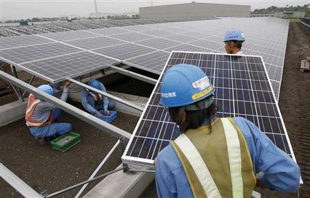 太陽光発電を行うソーラーパネルを設置する作業員たち。「全量買い取り」を大前提とした再生可能エネルギー買い取り制度が導入後わずか2年半で崩壊し、参入した発電事業者の事業計画にも大きな影響が予想される=2014年10月16日、神奈川県川崎市(ロイター)
