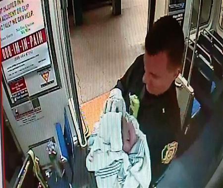 地下鉄車内で生まれたばかりの赤ちゃんを抱き抱えるダニエル・キャバン巡査部長=2014年12月25日、米ペンシルベニア州フィラデルフィア(南東ペンシルベニア交通局の監視ビデオから、AP)