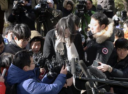 12月17日、ソウル西部地検に出頭し、記者団に囲まれる大韓航空の趙顕娥(チョ・ヒョナ)前副社長=2014年、韓国・首都ソウル(共同)