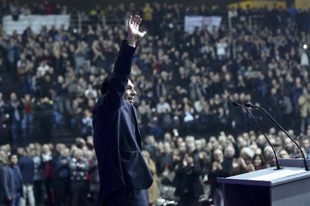 首都アテネでの集会で手を振るギリシャ最大野党、急進左派連合(SYRIZA)のアレクシス・ツィプラス党首=2015年1月3日、ギリシャ(AP)