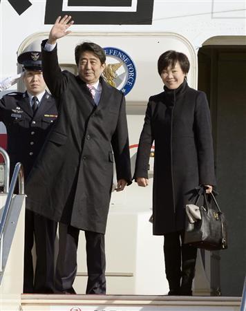 中東地域歴訪のため羽田空港を出発する安倍晋三(しんぞう)首相と昭恵夫人=2015年1月16日午前、東京都大田区(共同)
