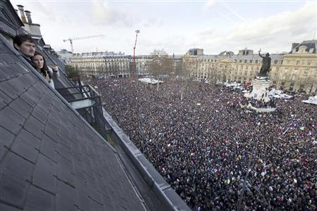 - 大規模デモ行進に参加するため出発地点のレピュブリック(共和国)広場に集まった人々を屋根の窓から眺める男女。デモには世界各国の首脳たちを含めてフランス全土で370万人が参加し、一連の事件による犠牲者の追悼とテロに屈しない姿勢を示した=2015年1月11日、フランス・首都パリ(AP)更新