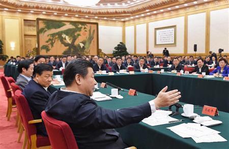 1月12日、地方幹部の前で演説する中国の習近平国家主席(手前)。習氏は権力基盤の強化を図る一方で、大学での思想教育の強化にも乗り出した=2015年、中国・首都北京市(新華社=共同)