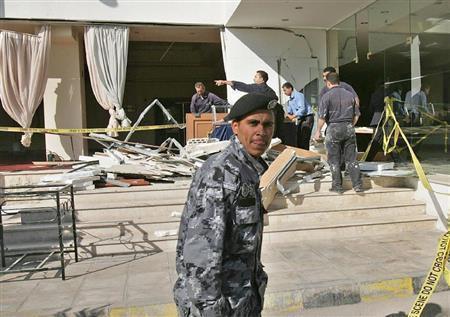 2005年11月10日、ヨルダン・首都アンマンでサジダ・リシャウィ死刑囚が自爆テロを図ったホテルの外に立つ警察官(ロイター=共同)