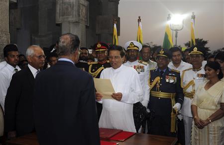 スリランカの中心都市コロンボで、就任宣誓を行うマイトリパラ・シリセナ新大統領(中央)。公約通り、前政権時代の中国頼みの姿勢から脱却できるか、注目される=2015年1月9日(ロイター)